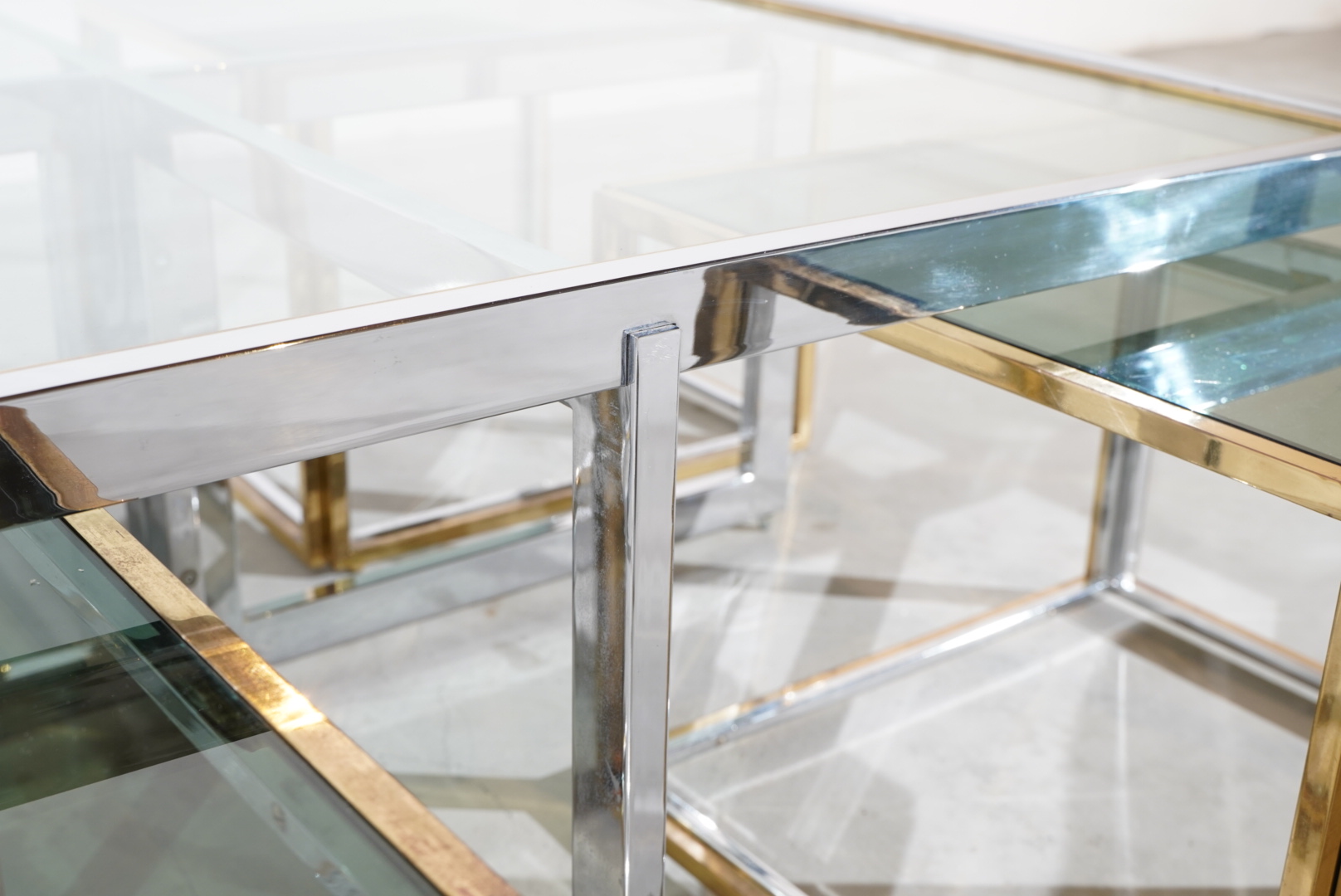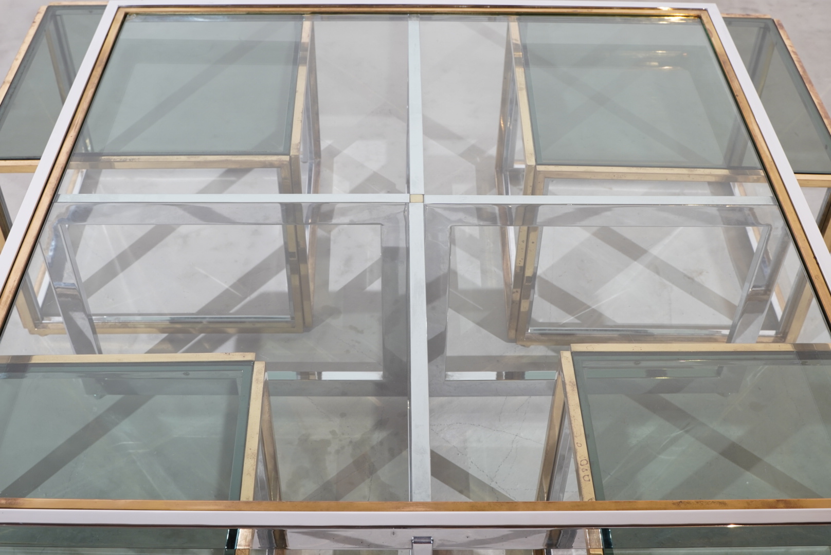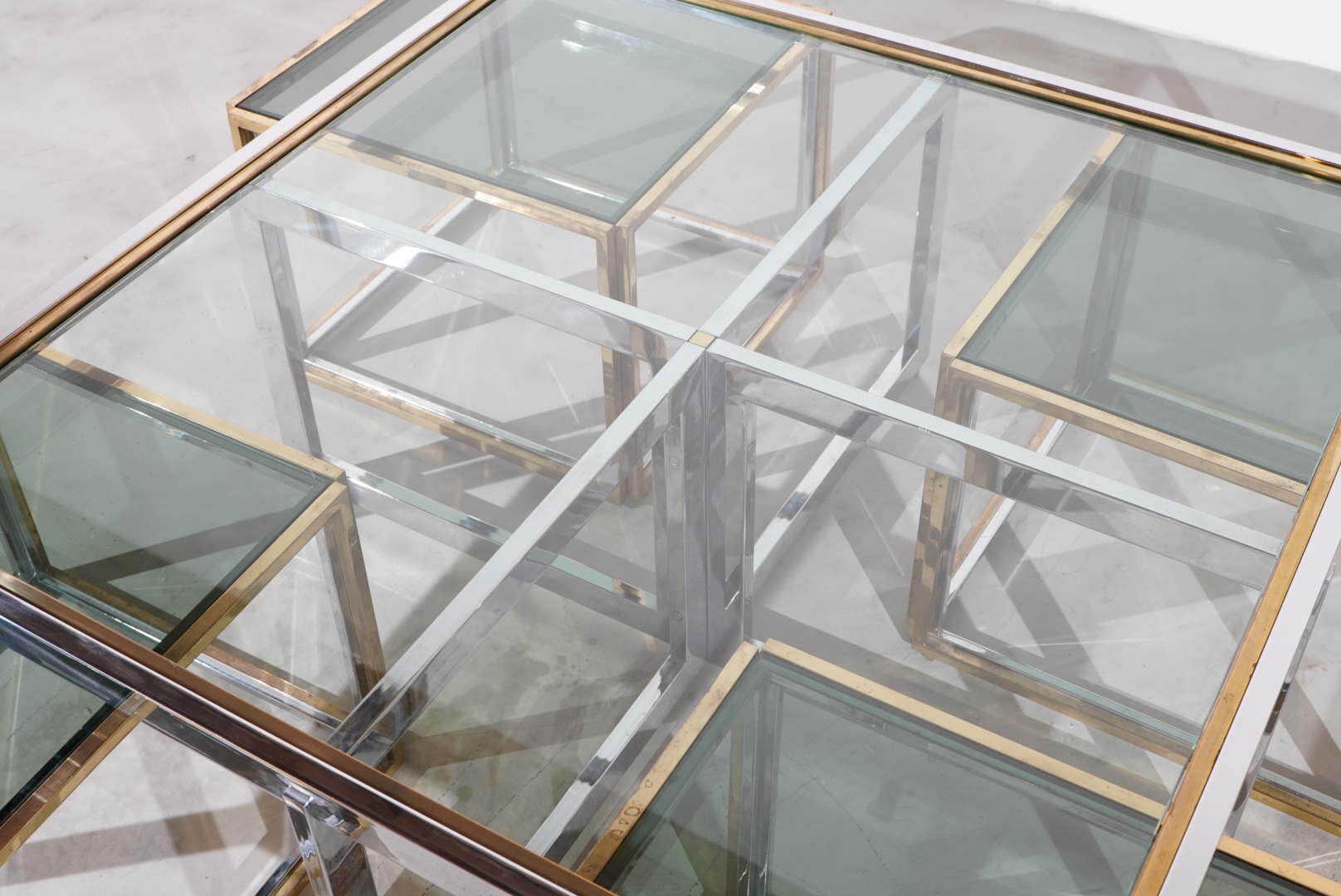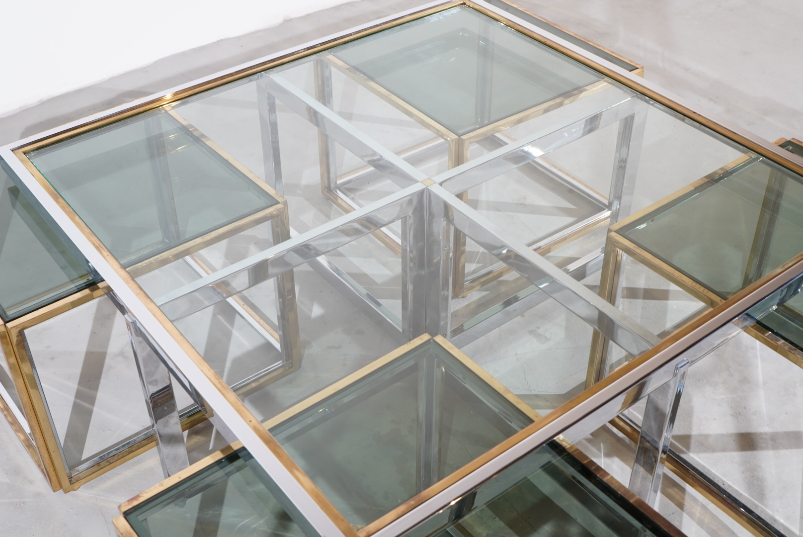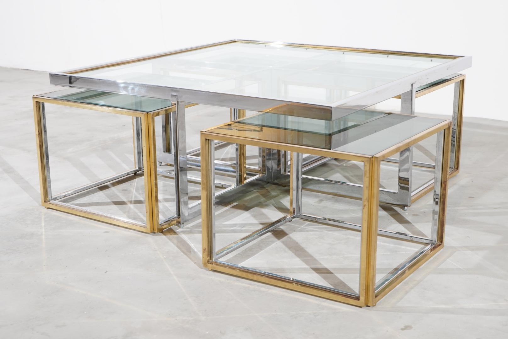 Couchtisch im Space Age Design hergestellt in den 70s in Italien und designt vom bekannten Designer Romeo Rega. Es lassen sich 4 separate Beistelltische, welche mit Messing beschichtet sind frei anordnen.
