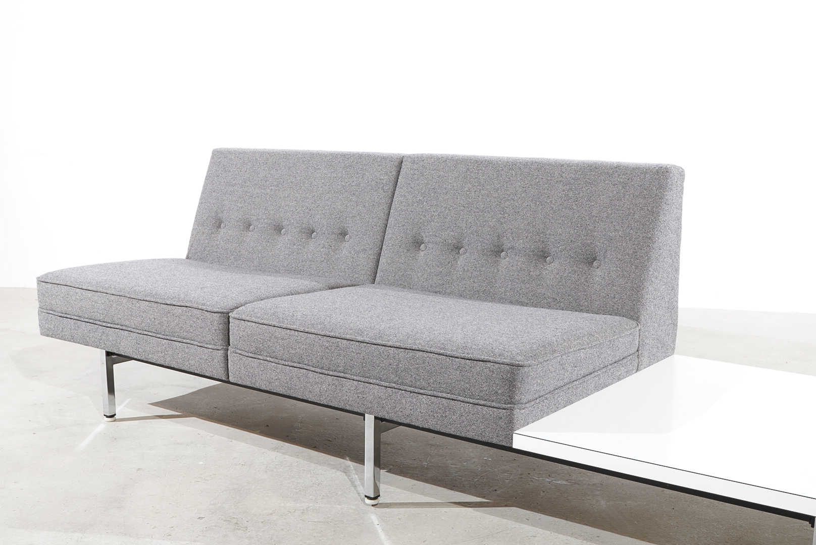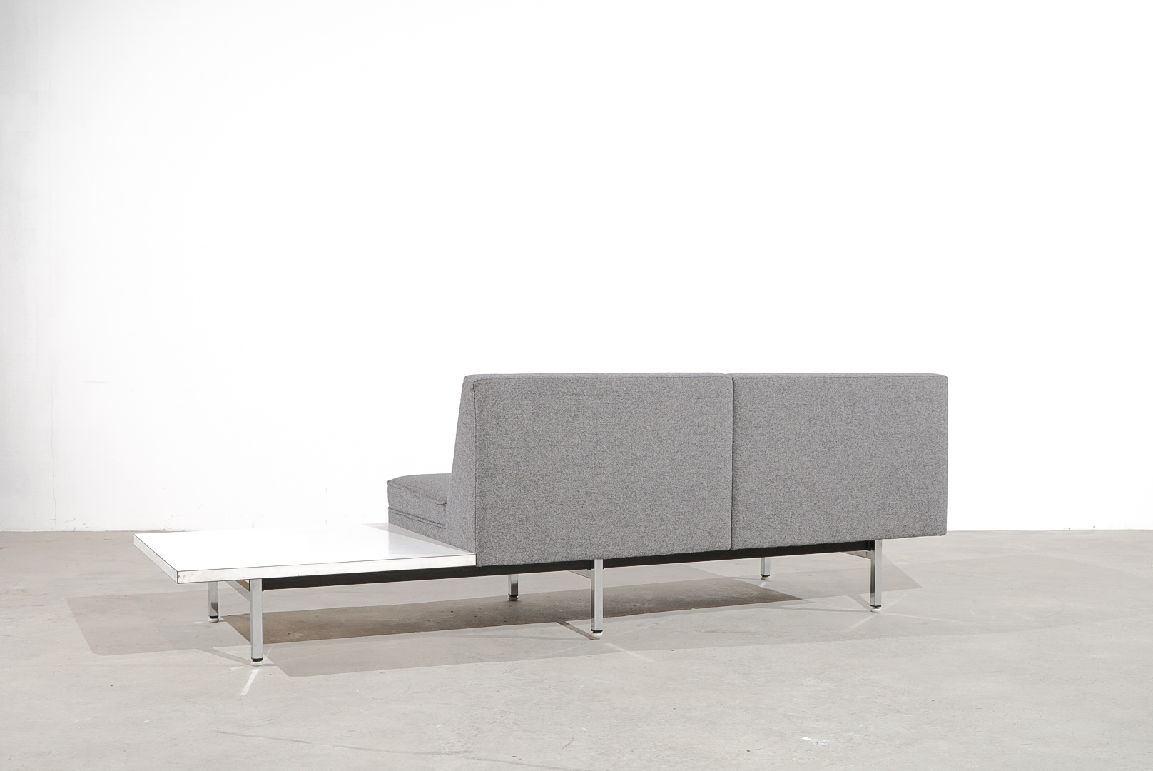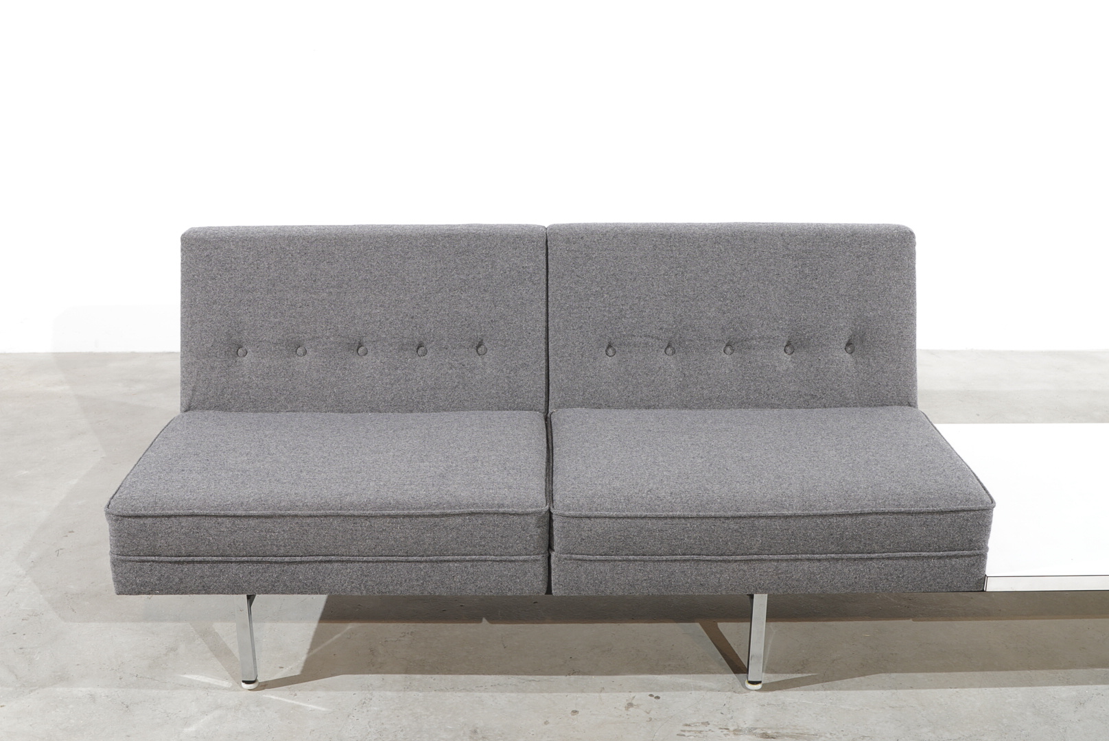Dieses modulare 2-Sitzer-Sofa wurde neu mit grauem Stoff bezogen und verfügt über eine praktische Abstellfläche. Klare Linien, flexible Anordnungsmöglichkeiten und hochwertiges Design machen es zu einem stilvollen und funktionalen Möbelstück für Wohnzimmer, Lounges oder Büros.
