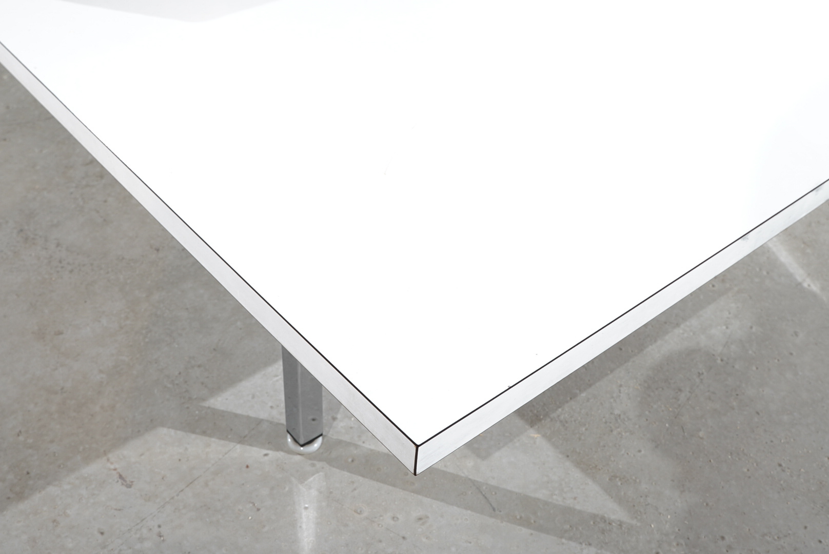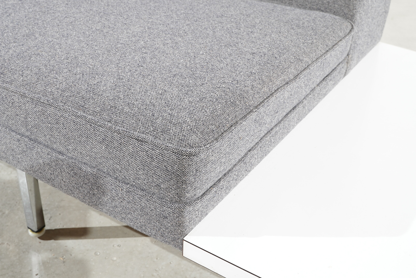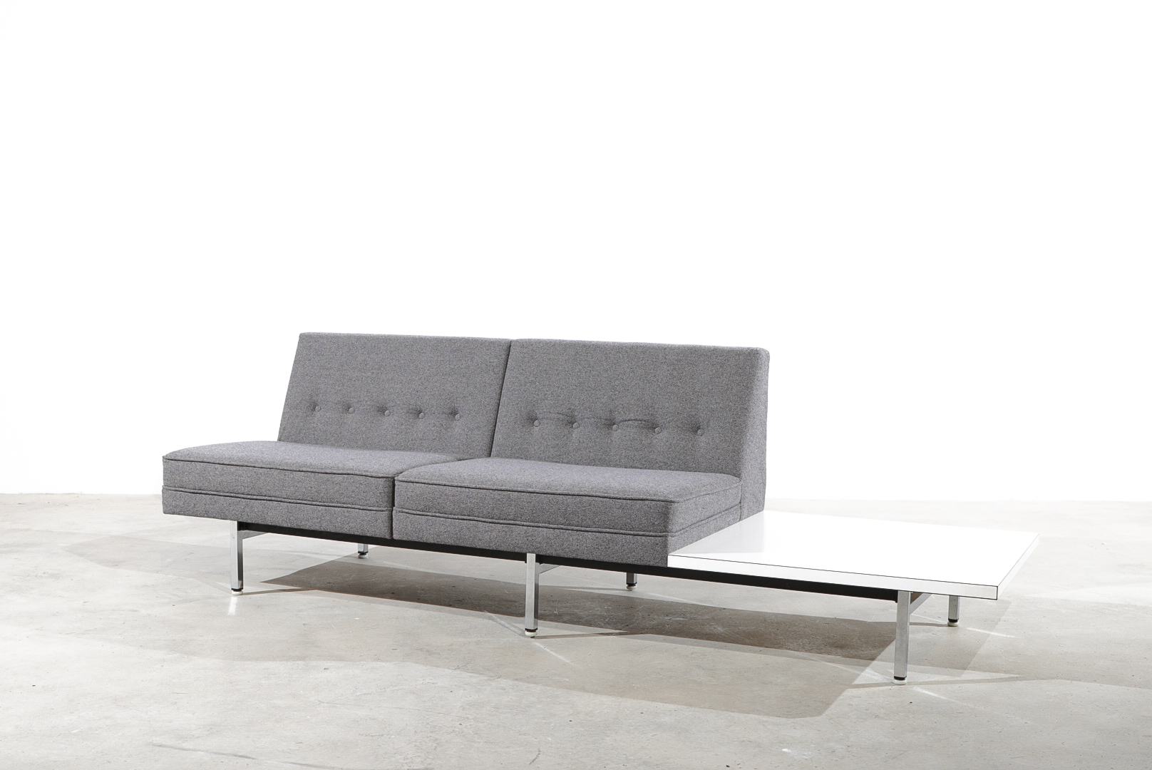 Dieses modulare 2-Sitzer-Sofa wurde neu mit grauem Stoff bezogen und verfügt über eine praktische Abstellfläche. Klare Linien, flexible Anordnungsmöglichkeiten und hochwertiges Design machen es zu einem stilvollen und funktionalen Möbelstück für Wohnzimmer, Lounges oder Büros.