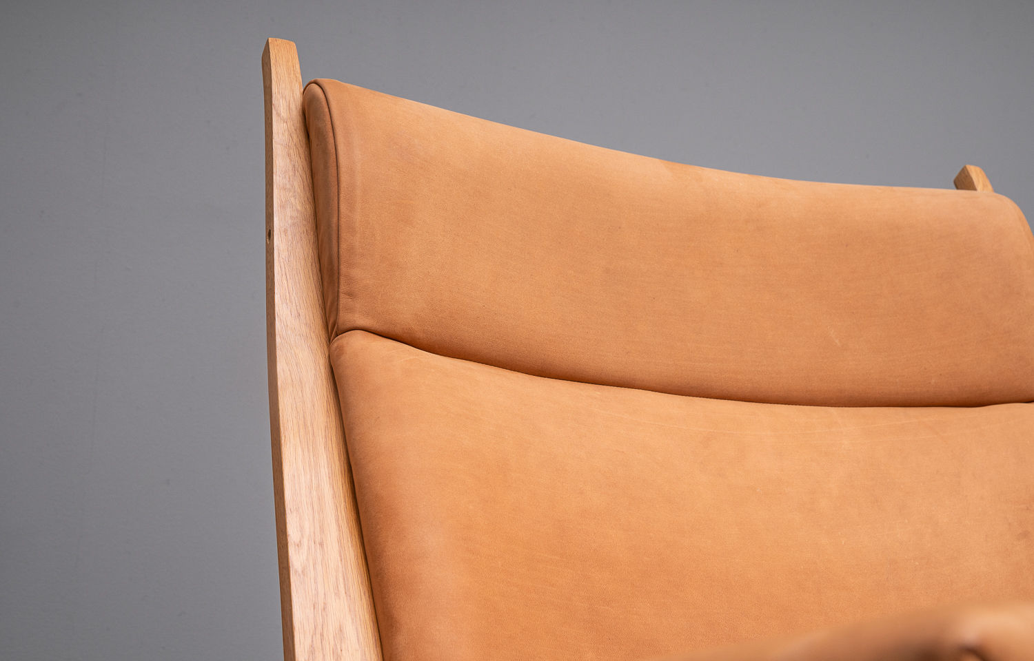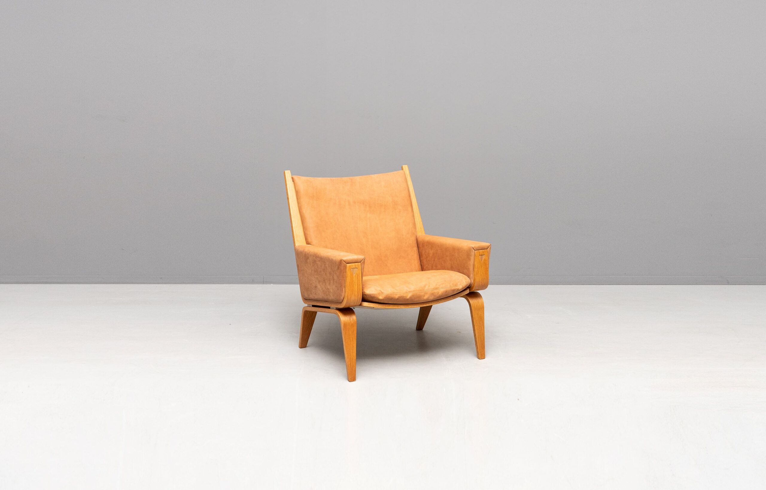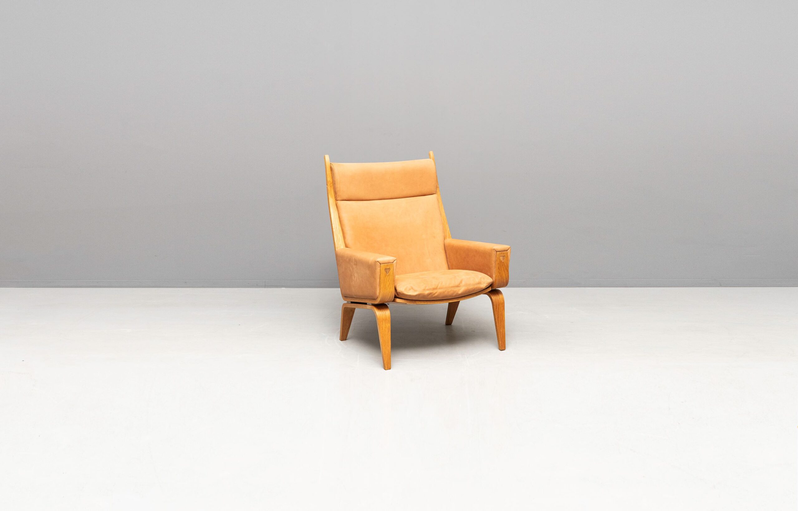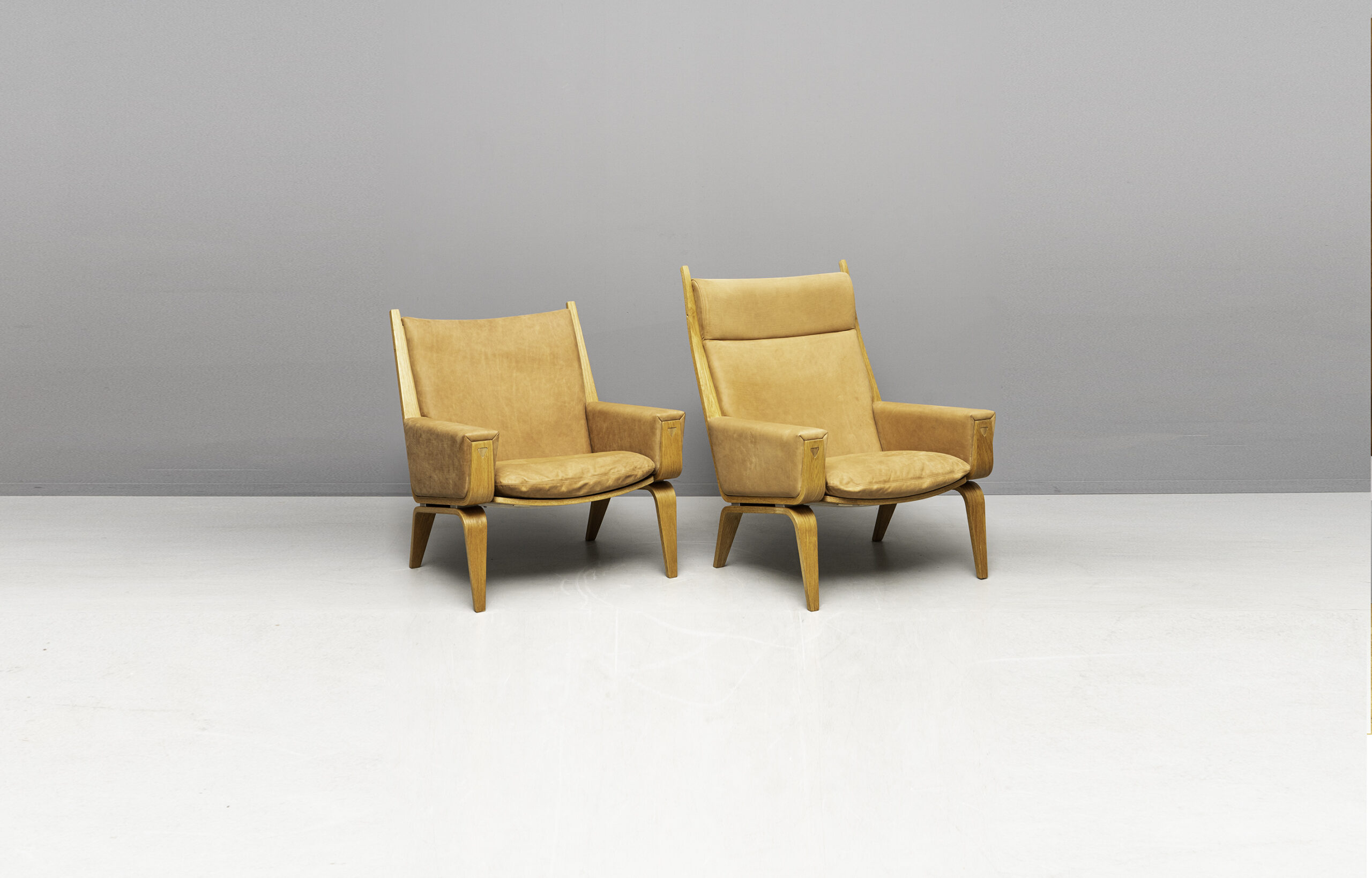 Wunderschöne GE 501A und GE 501 Sessel, entworfen von Hans J. Wegner und produziert von Getama. Eichenholzgestell, bezogen mit Nubukleder.