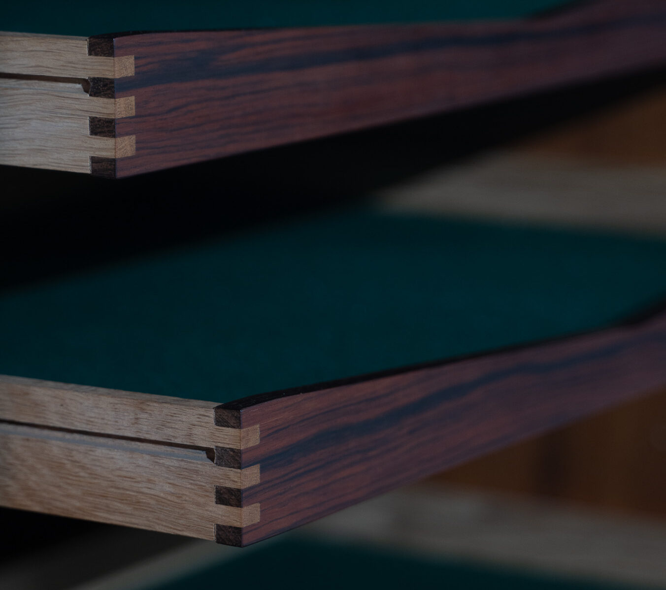 Die handwerkliche Qualität zeigt sich in jedem Detail: sorgfältig geformte Kanten, gut proportionierte Griffe der Schiebetüren und sauber gearbeitete Beine. Diese Elemente verleihen dem Sideboard eine Qualität, die sofort ins Auge fällt. Es ist ein Möbelstück, das seine handwerkliche Meisterschaft im wahrsten Sinne des Wortes sichtbar macht.