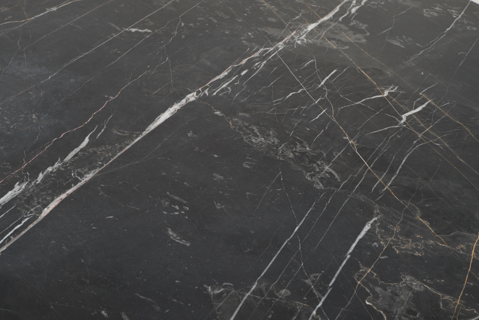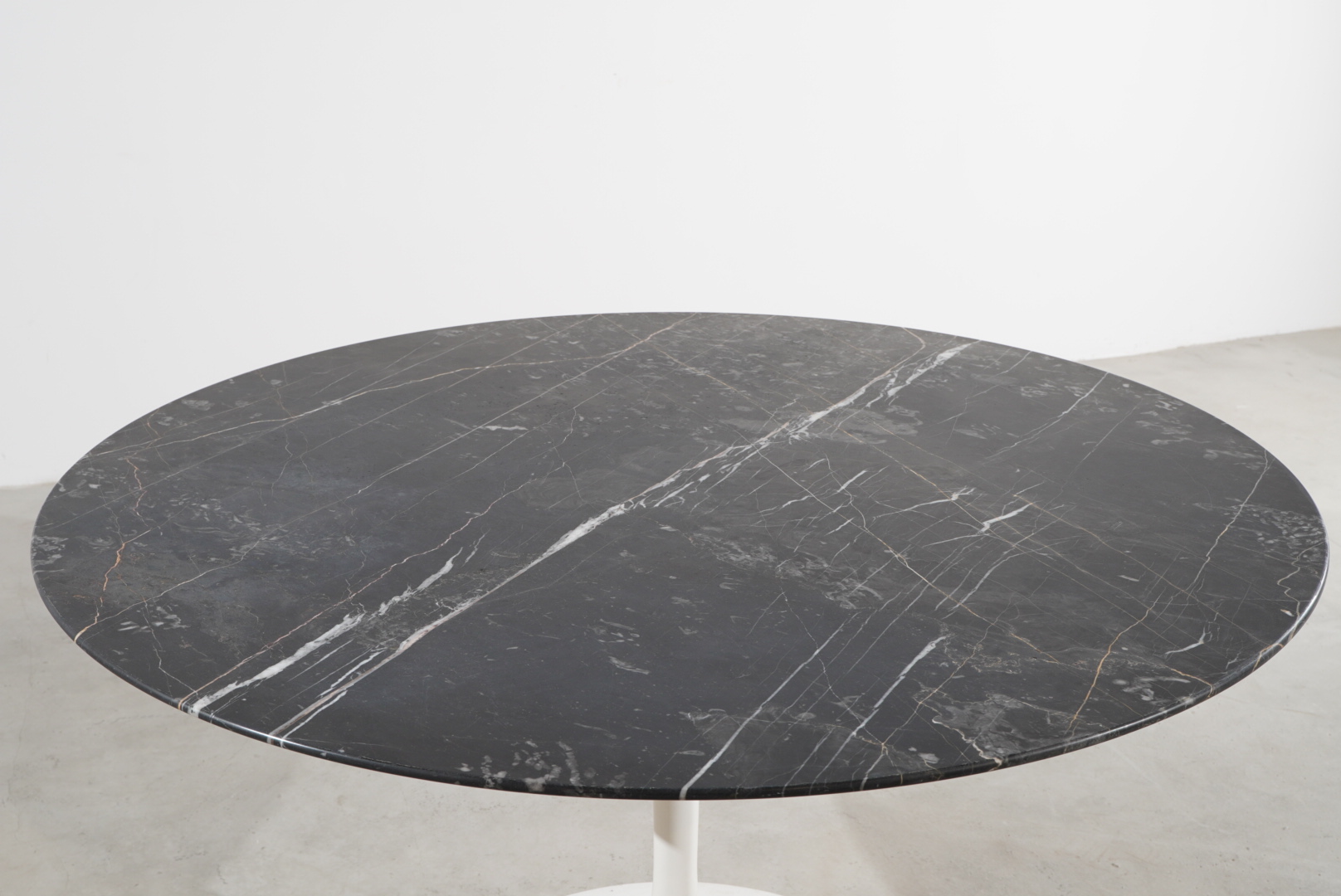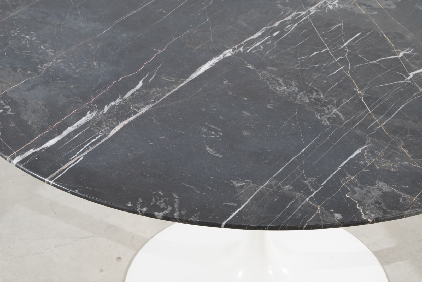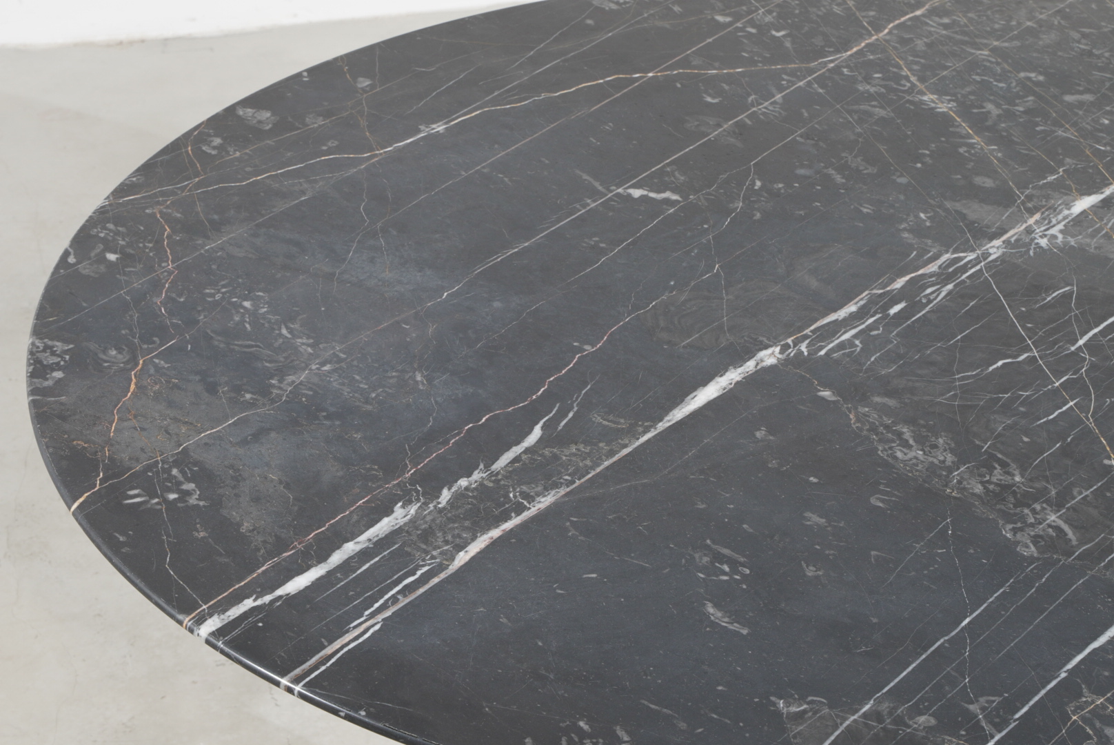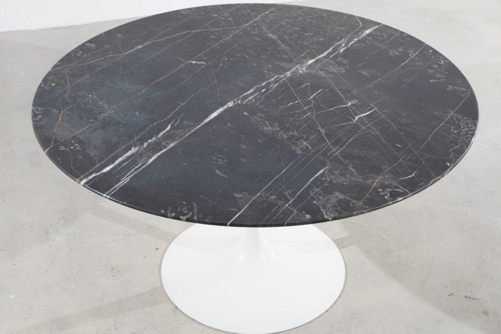 Die Tischplatte besteht aus edlem Nero-Marquina-Marmor.